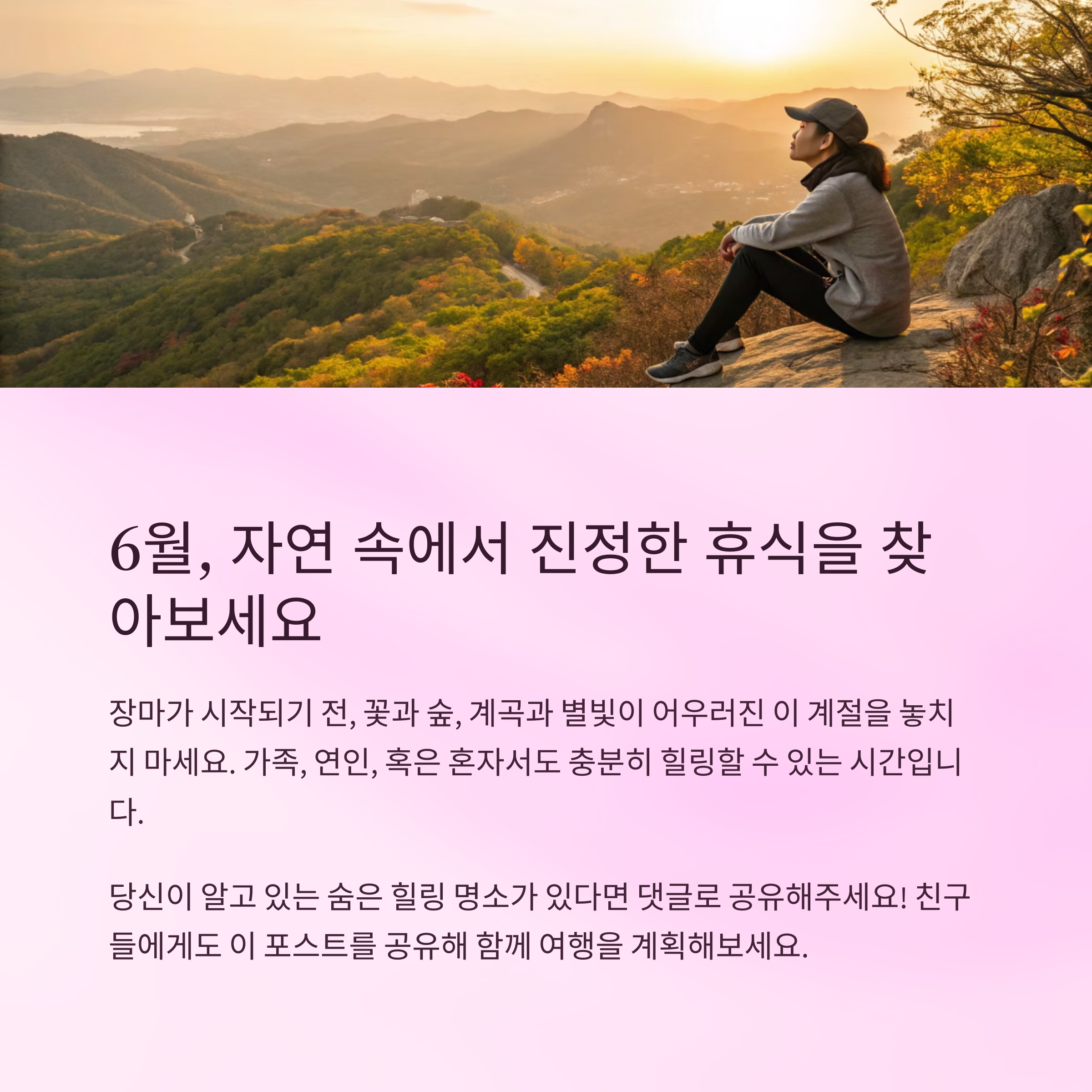 6월은 여름의 초입으로, 꽃과 숲, 계곡과 별빛이 어우러진 자연 힐링 여행의 최적기입니다.