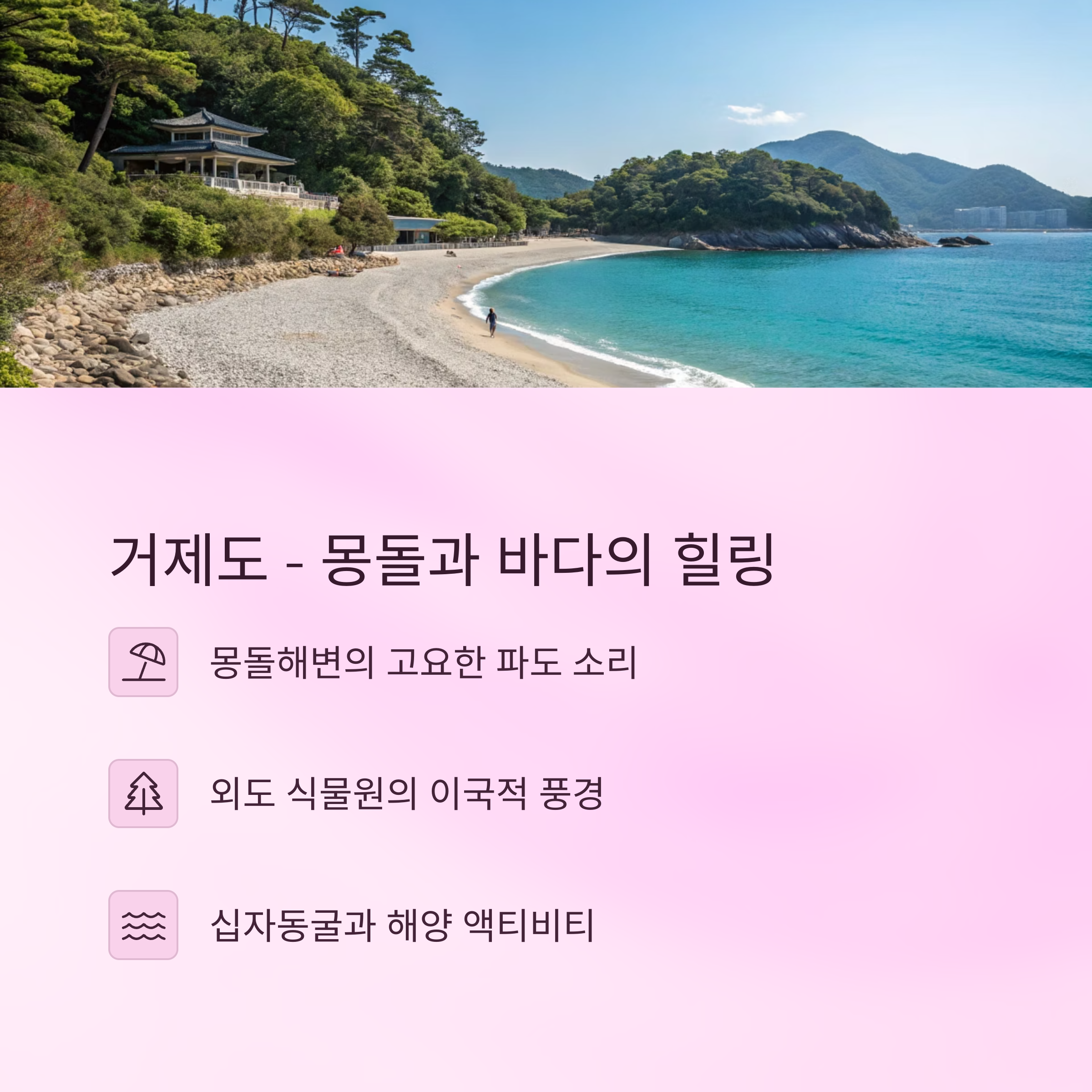 | 거제도 | 바다, 몽돌, 식물원 | 해양 액티비티, 외도, 십자동굴 |