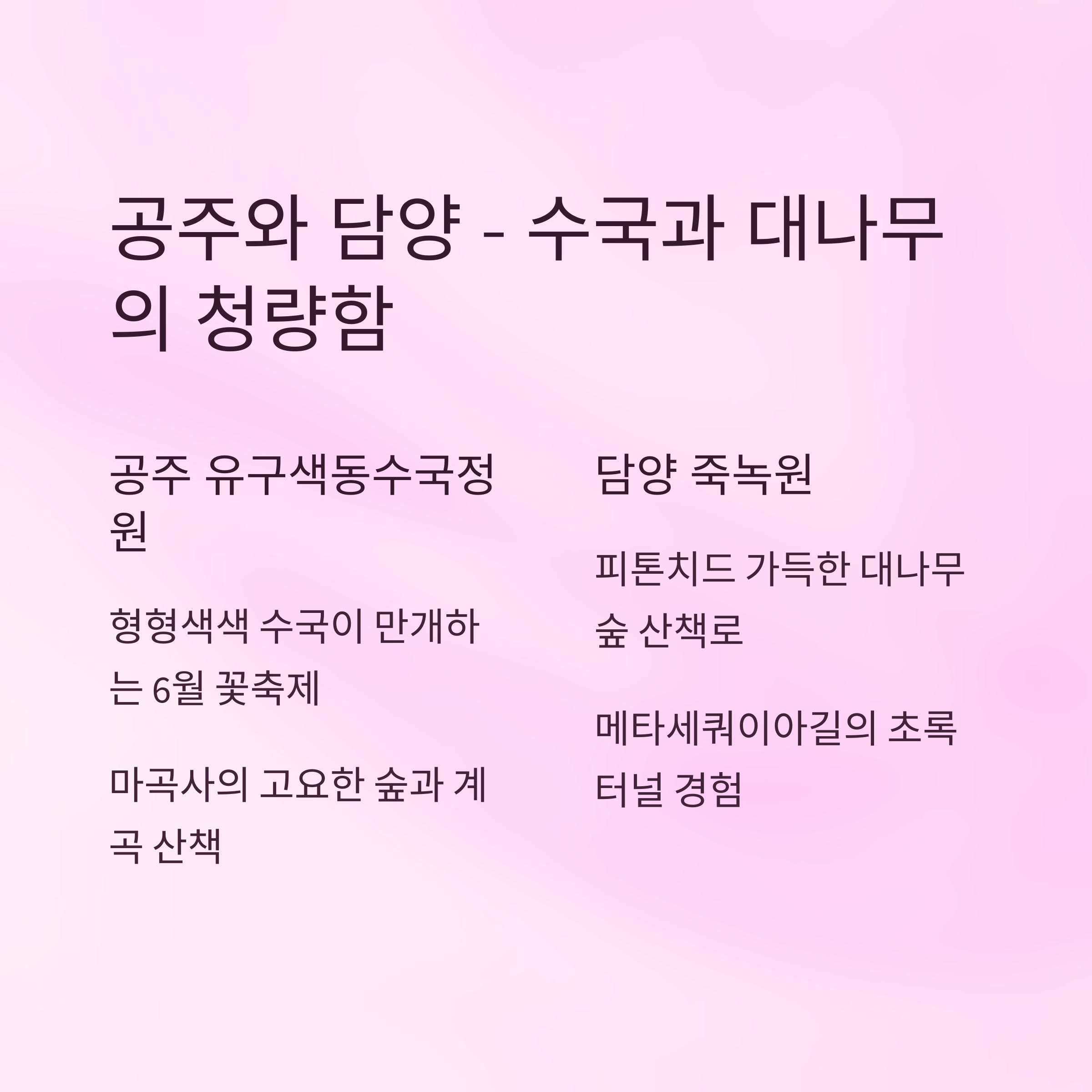 | 담양 | 대나무숲, 터널길 | 죽녹원 산책, 피톤치드 힐링 |