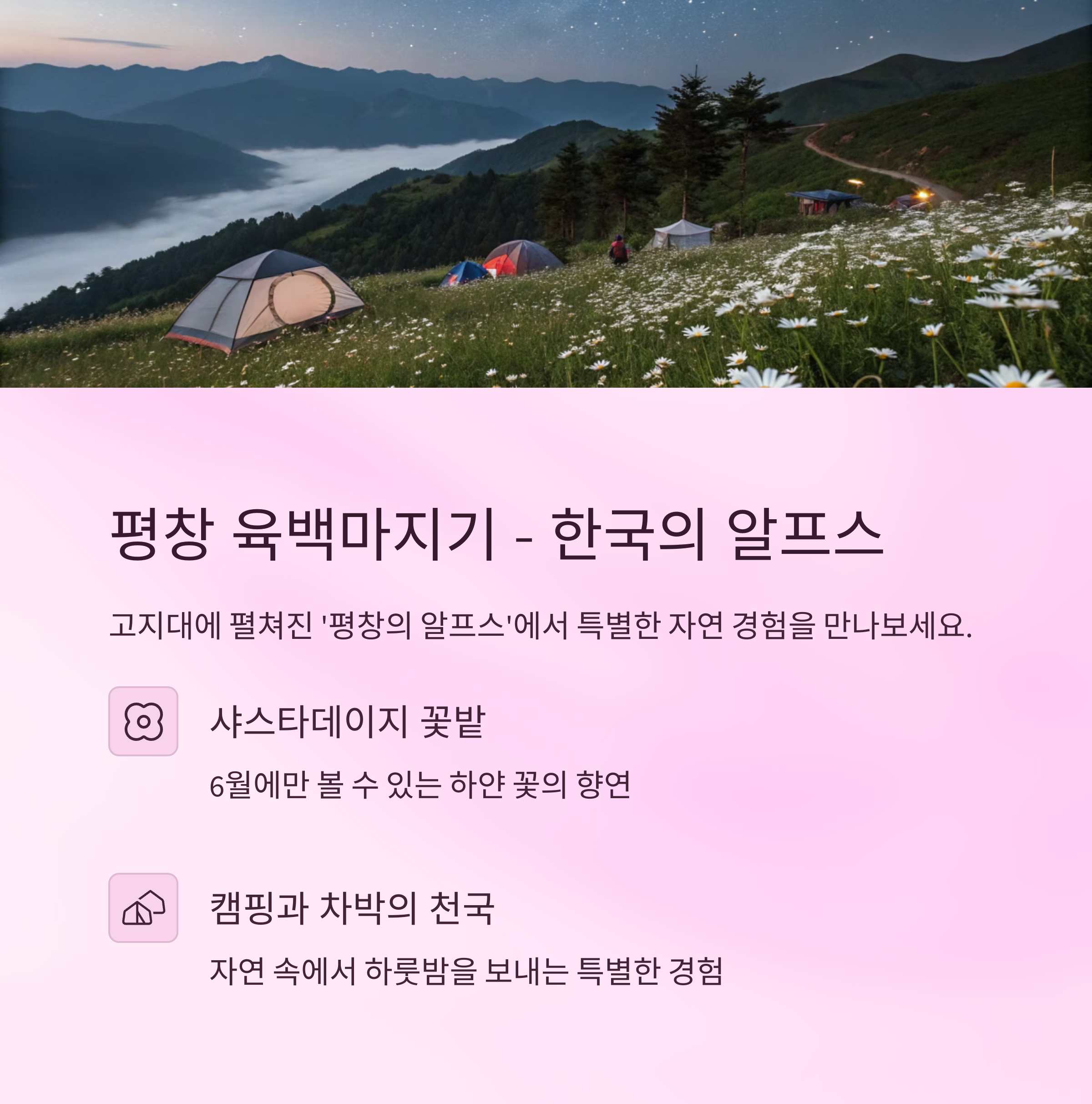 | 평창 | 고지대, 꽃밭, 캠핑 | 샤스타데이지, 차박, 알프스풍 |