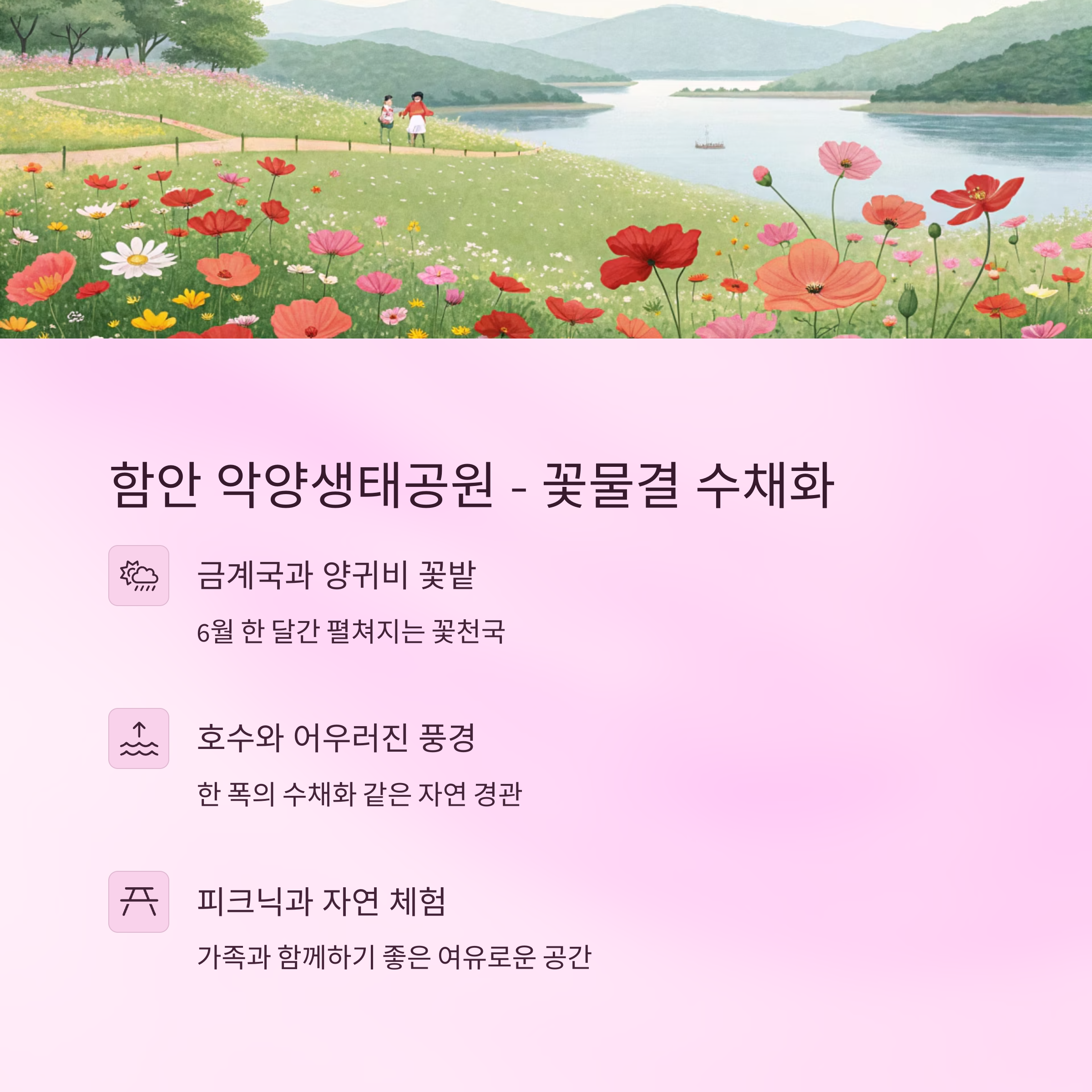 | 함안 | 꽃밭, 호수, 생태 | 양귀비, 금계국, 산책과 피크닉 |