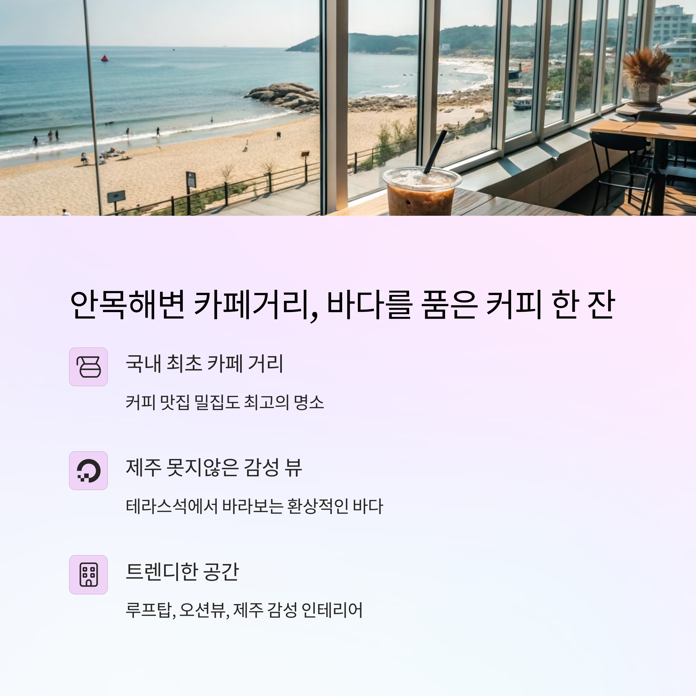 | 안목카페거리 | 오션뷰 감성 카페 | 아이스커피, 힐링 |