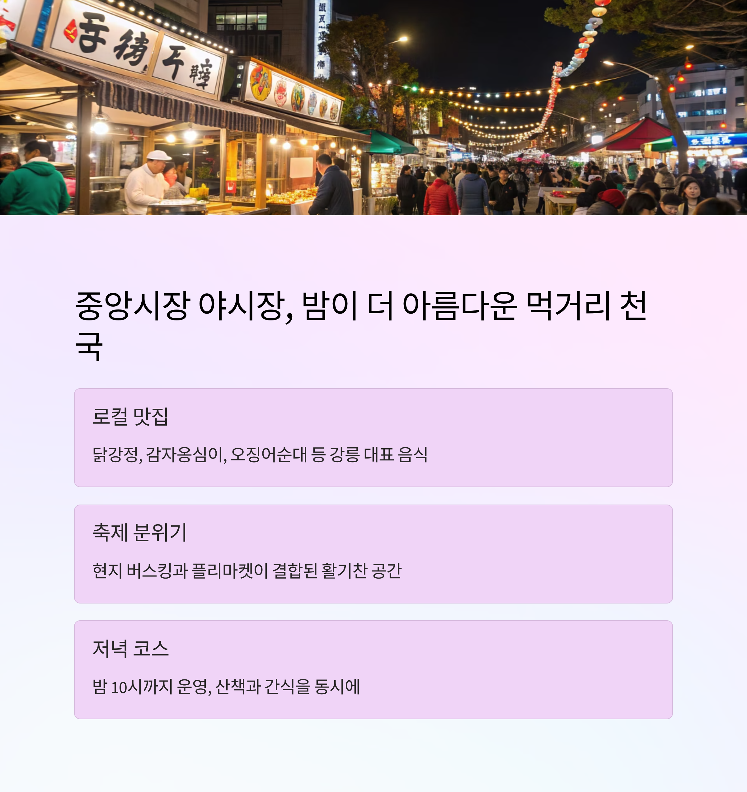 | 강릉 중앙시장 | 야시장 간식 천국 | 오징어순대, 야식 |