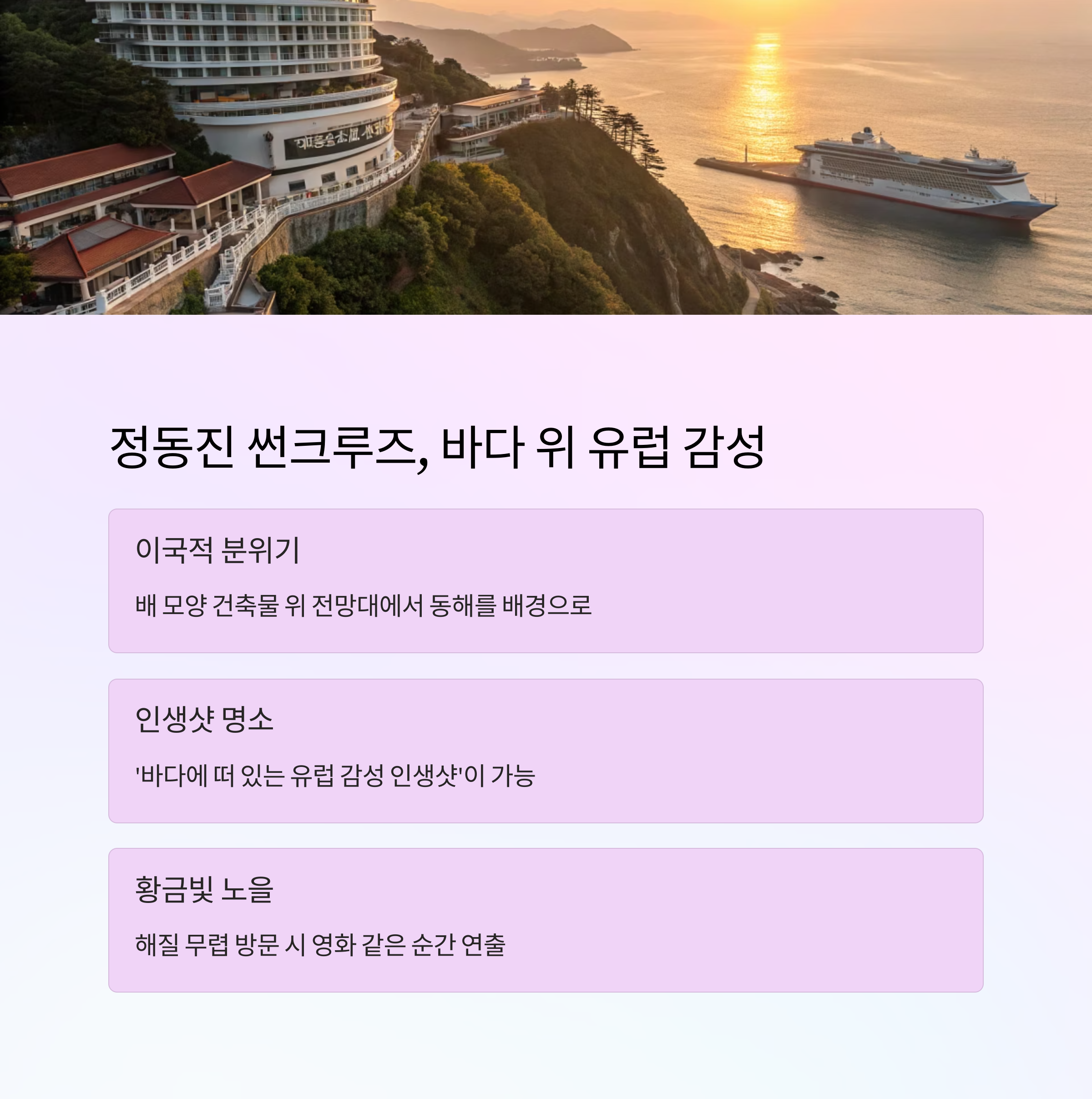| 정동진 썬크루즈 | 바다 위 유럽 감성 뷰 | 인생샷, 노을 |